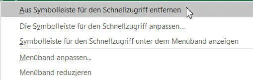 Du platzierst den Mauszeiger auf die Schaltfläche und klickst mit der rechten Maustaste. Anschließend erscheint ein Menü, präziser ausgedrückt ein Kontextmenü, in dem du die Schaltfläche wieder aus der Symbolleiste für den Schnellzugriff entfernen kannst.